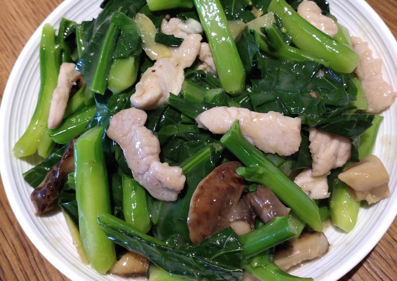 - Marinate pirk with soy sauce set aside.Soak kale in salted water for 15 mins.After that wash again.Then cut off and separate the leaves and the stalks.Heat a pan and add oil then sautee mushroom.until.golden brown remove.Continue stir fry ginger and garlic until aromatic then add in.pork.Stir fry until it changes colour.Pour in stalks and.mushroom. then add just a little water.Cook for two mins then add the leaves.Pour oyster sauce Cover and cook.When.already half done add in flour